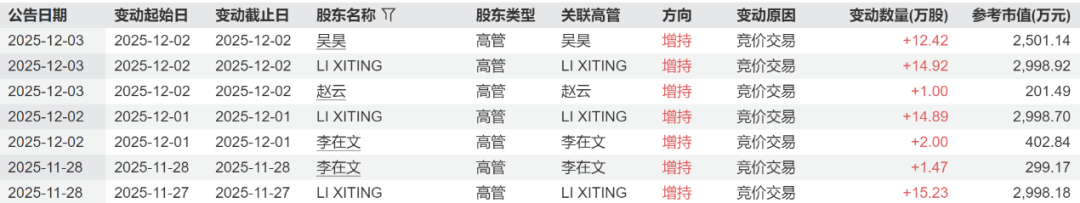 据统计,12月1日和12月2日,李西廷继续以集中竞价交易方式,分别增持2998.7万元、2998.92万元。